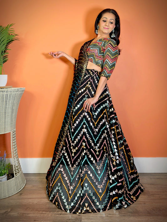 Lightweight Black Embroidered Lehenga Set with Leheriya dupatta