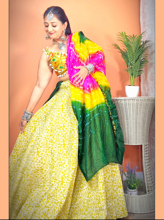 Handblock printed Cotton Chaniya with Kutch Mirror Work Choli & matching Dupatta