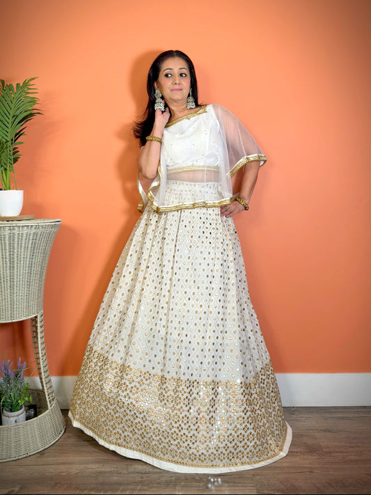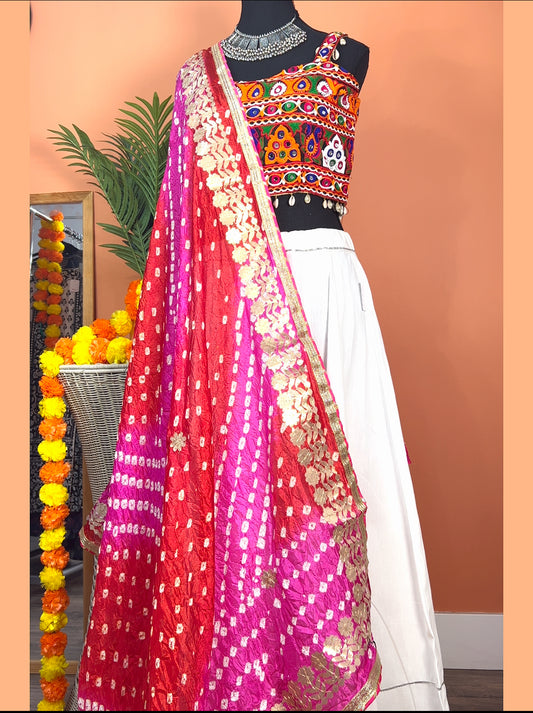 White Chaniya with Kutch Mirror Work Choli & Kutchi Dupatta