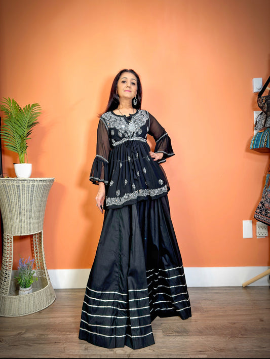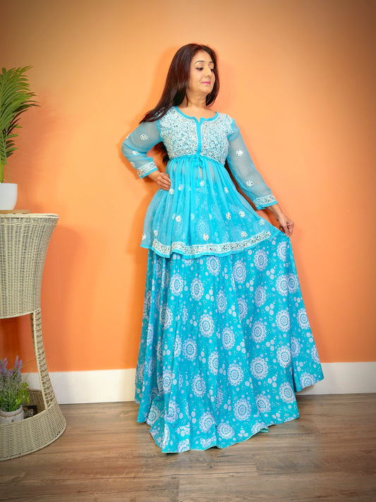 Chikankari Perfection: Peplum Top & Maxi Flare Skirt Set