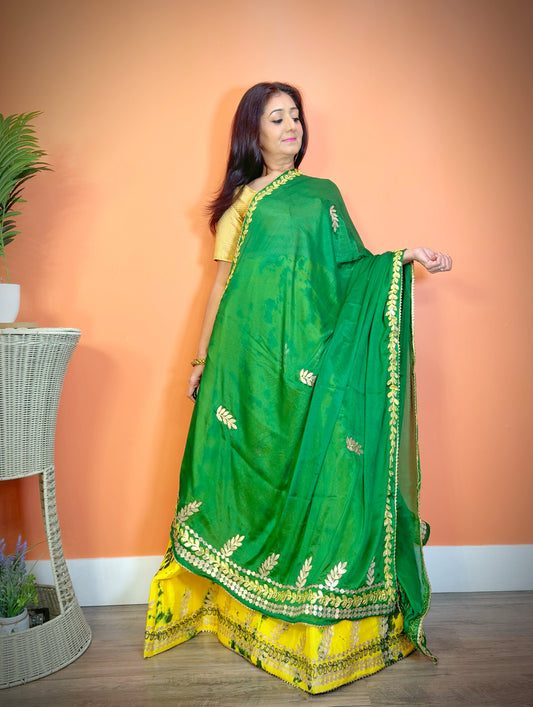 Elegant Green Chinnon Silk Shibori Gota Patti Lehenga Set