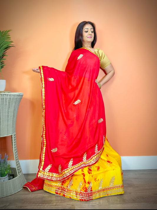 Elegant Red Chinnon Silk Shibori Gota Patti Lehenga Set