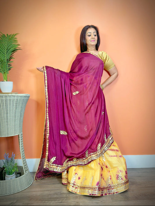 Elegant Wine Chinnon Silk Shibori Gota Patti Lehenga Set