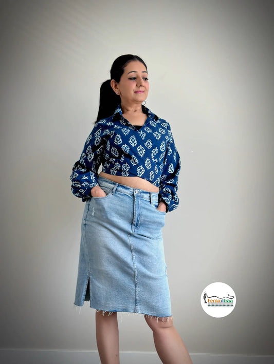 Tarangini - Mulmul Cotton Handblock Wrap Around Crop Top - Indigo dye