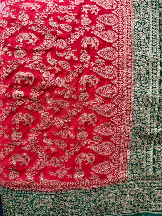 Handwoven pure Banarasi Khaddi Georgette Saree in Red & Green