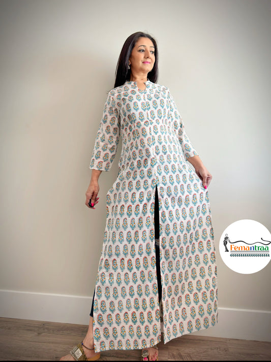 Boho Chic Elegance: Front Zipper Mulmul Handblock Tunic Kurti