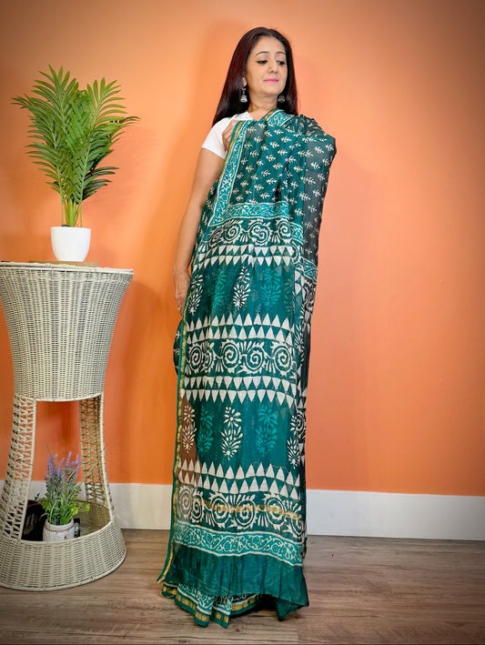 Ethnic Elegance: Green Chanderi Cotton Handblock Print Saree