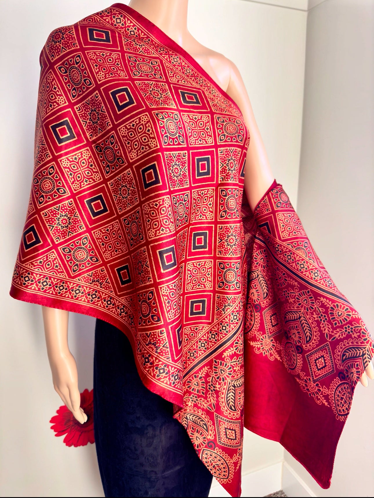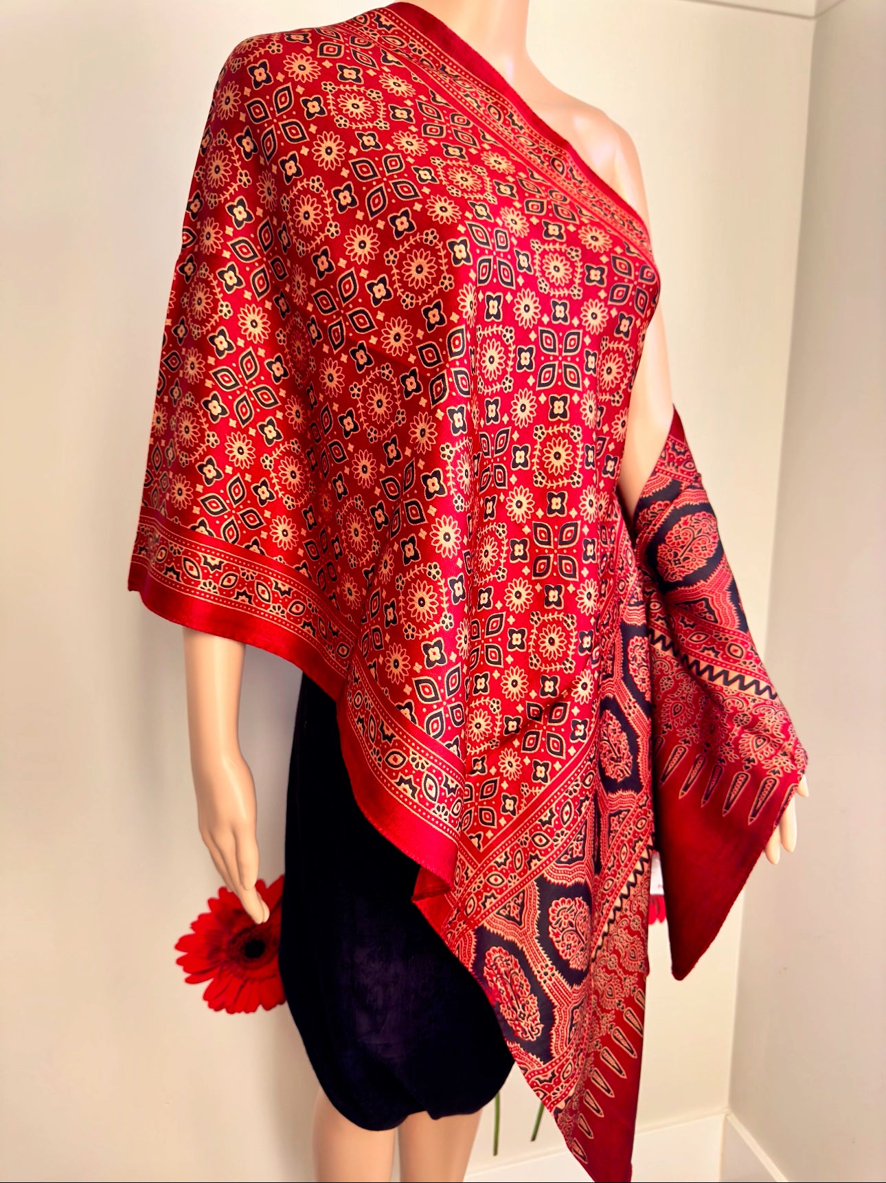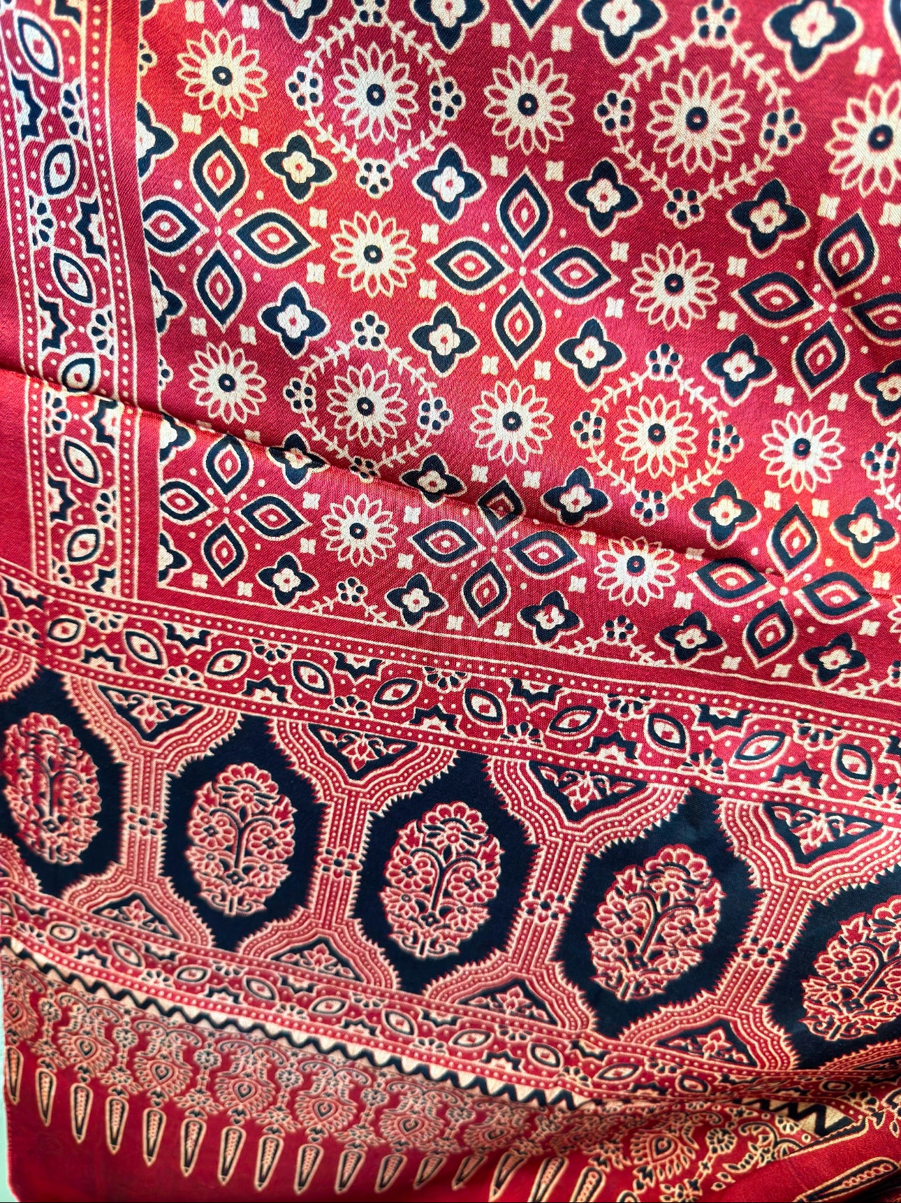 Buttery soft and glossy, this enticing "Mashru Silk"  "Ajrakh Handblock print" stole in all natural vegetable based dyes is a testament of artistry and is versatile to be styled multiple ways , occasional, casual or formal.