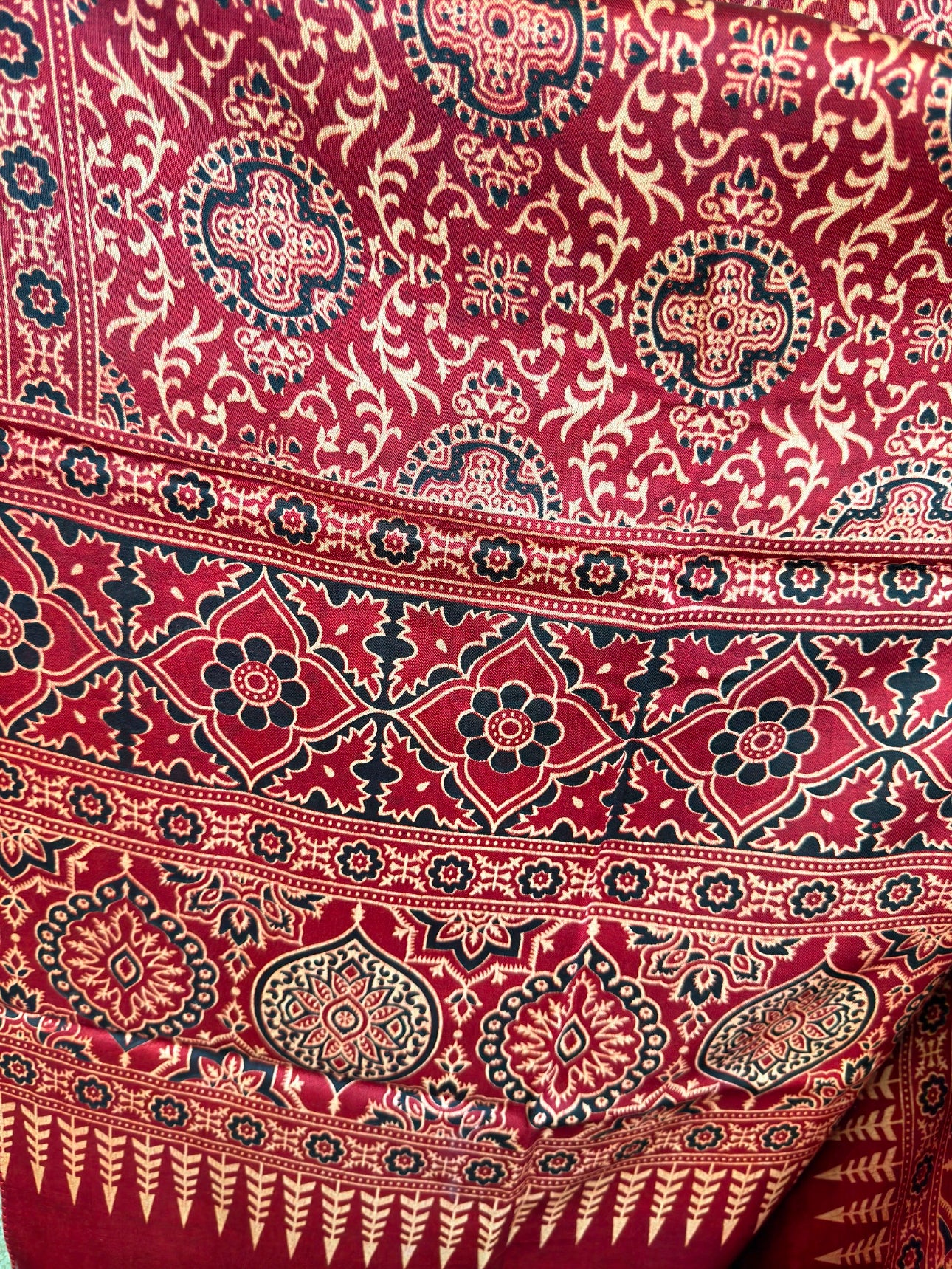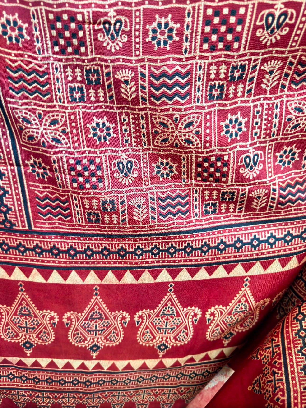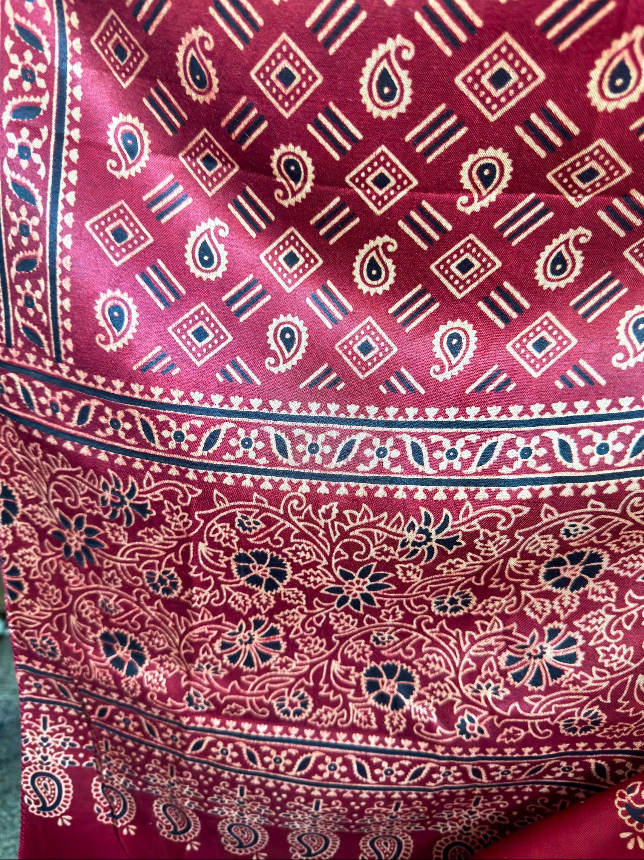 Buttery soft and glossy, this enticing "Mashru Silk"  "Ajrakh Handblock print" stole in all natural vegetable based dyes is a testament of artistry and is versatile to be styled multiple ways , occasional, casual or formal.