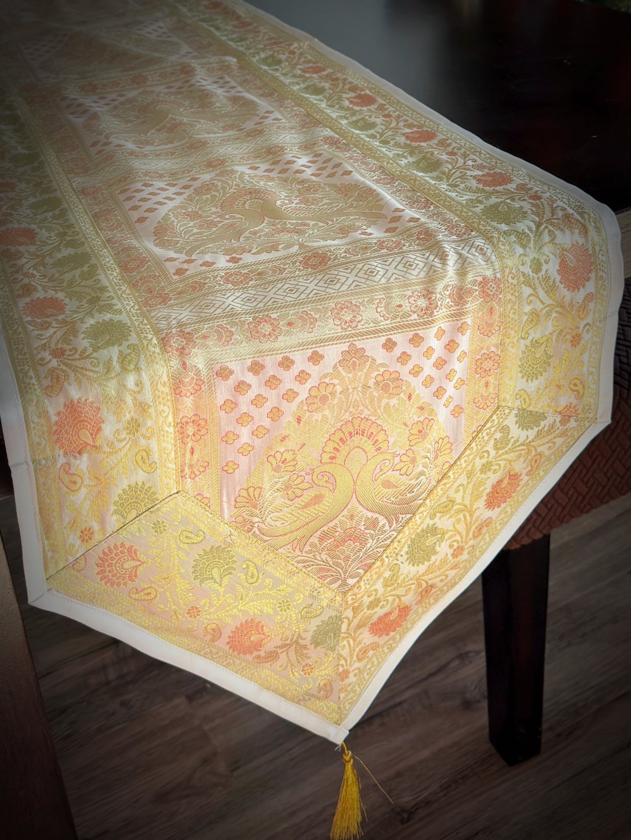 Experience the epitome of timeless elegance with our "Banarasi Silk" Decorative Runner, a single-colored masterpiece adorned with golden thread tassels, designed to infuse your space with opulence.