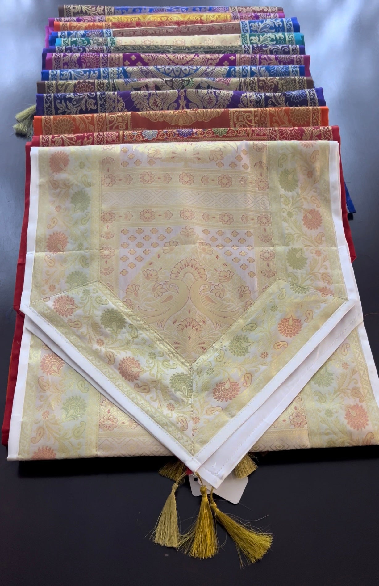 The golden thread tassels add a touch of regality, elevating this runner to a realm of unmatched sophistication. Versatile in its application, this shiny and elegant creation transcends its traditional role, making it an ideal choice for table decor, wall adornment, or even as a captivating element in wedding decor.