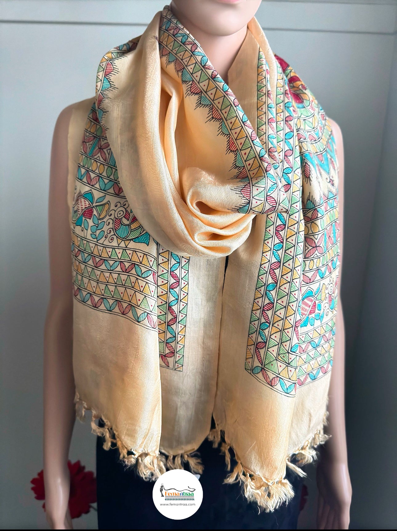 Our Pale banana "Madhubani" stole is a testament to the artistic heritage dating back to the "Ramayana" era. Handpainted with natural pigments by skilled artisans in exquisite designs blending history and style. Wearing this stole you become a canvas of artistry and ancient traditions.